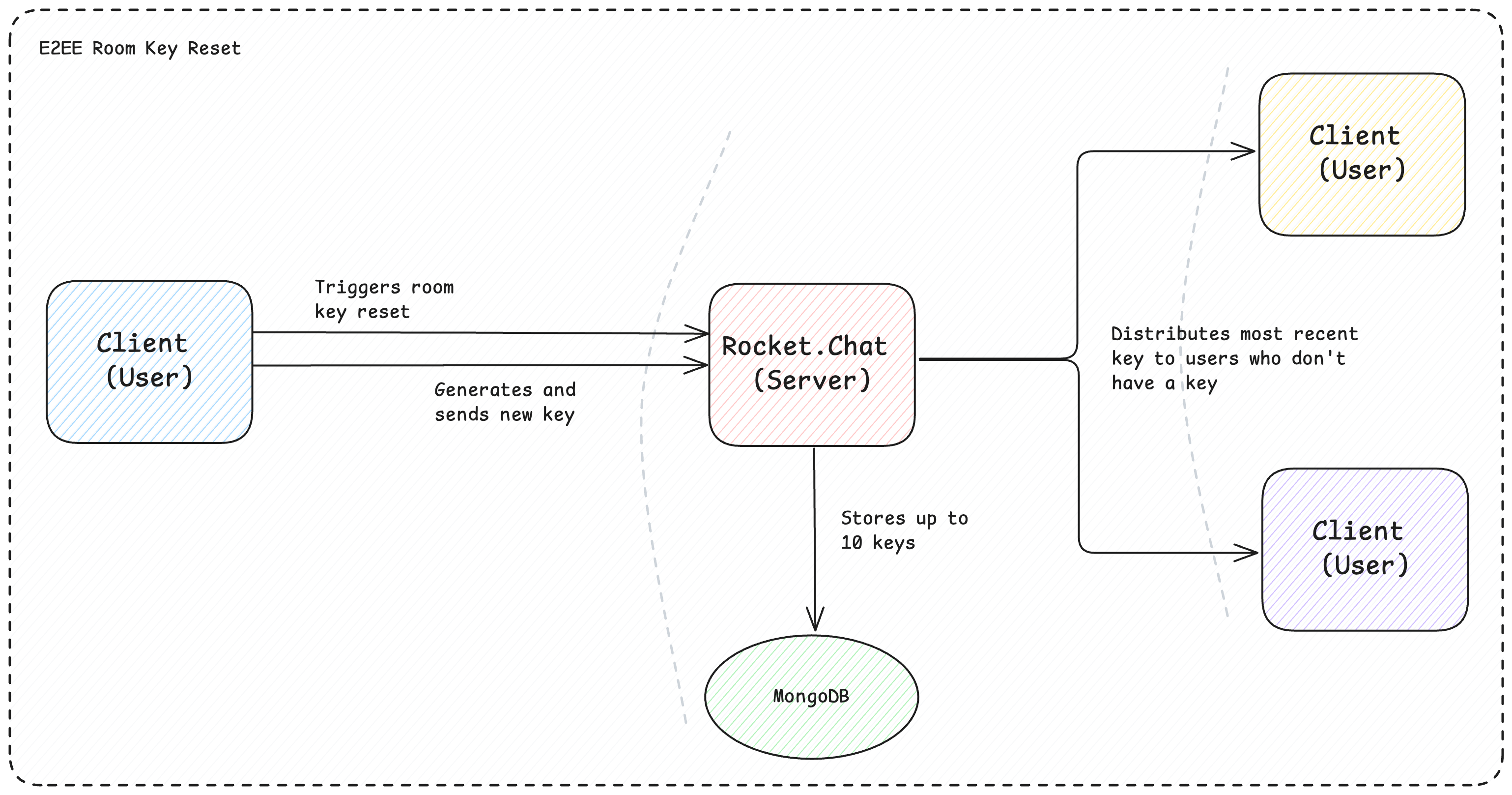 However, what happens if some users still have an E2EKey on their subscription? The server doesn’t know if this key continues to be valid, so to prevent unwanted data loss, it will move the user’s E2EKey to a new property called oldRoomKeys. This array contains keys that were on the user subscription when a room key reset happened. Clients will then use this information to try to decrypt old messages.